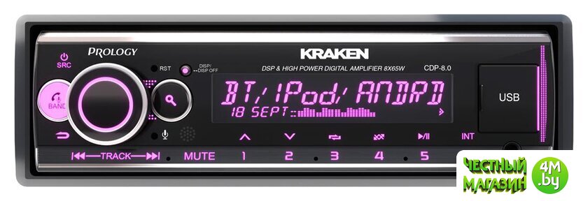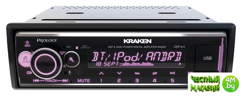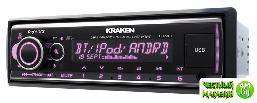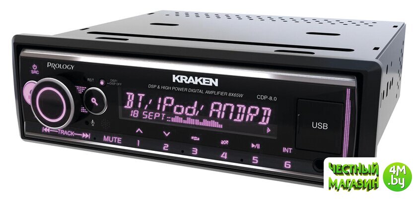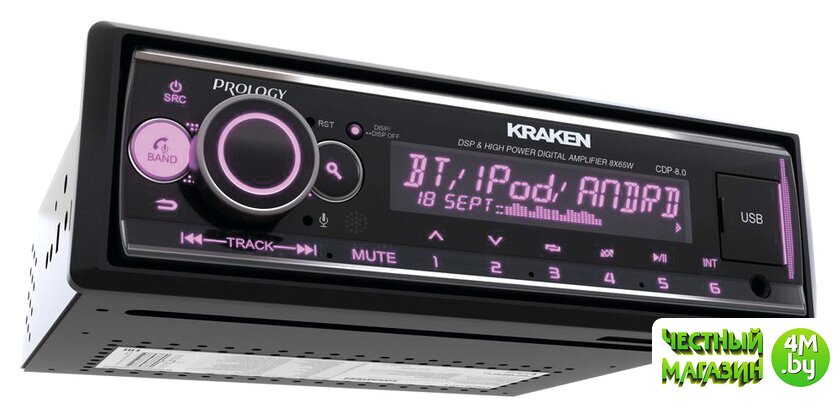 PROLOGY CDP-8.0 KRAKEN — FM / USB ресивер с Bluetooth и встроенным DSP - аудиопроцессором, стандартного размера 1DIN, который обеспечивает прием радиостанций в диапазоне FM / УКВ и воспроизведение медиафайлов MP3, WAV и FLAC форматов, записанных на USB накопители, передачу звука с внешних источников через линейный аудиовход и беспроводной интерфейс Bluetooth. Поддерживается управление мобильным телефоном через интерфейс Bluetooth (ver. 4,2).