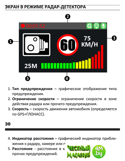 Навигация | GPS+ГЛОНАСС (Оповещения о стационарных камерах фотофиксации, отображение скорости и географических координат, синхронизация даты и времени) |