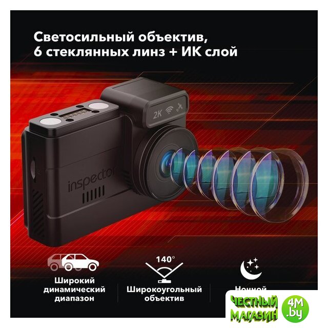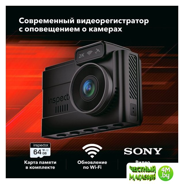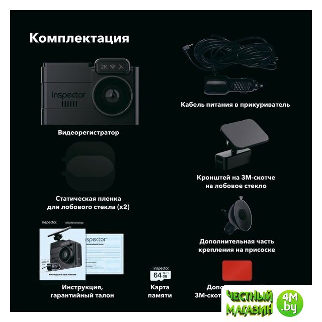 | Комплектация | - Видеорегистратор;, - Карта памяти MicroSDXC INSPECTOR 64Gb (установлена в видеорегистратор);, - Магнитное крепление на 3М-скотче;, - Доп. часть крепления на присоске;, - Доп. 3М-скотч для крепления;, - Статическая пленка для лобового стекла (2 шт.);, - USB Type-C кабель питания в прикуриватель;, - Инструкция по эксплуатации;, - Гарантийный талон. |