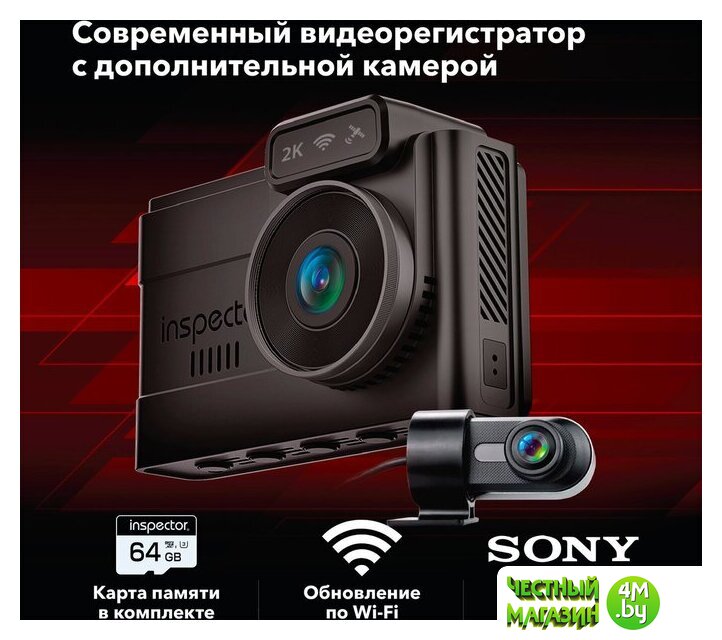 | Комплектация | - Видеорегистратор, - Карта памяти MicroSDXC INSPECTOR 64Gb (установлена в видеорегистратор), - Задняя камера с кабелем 6,5м, - Магнитное крепление на 3М-скотче, - Доп. часть крепления на присоске, - Доп. 3М-скотч для крепления, - Статическая пленка для лобового стекла (2 шт.), - USB Type-C кабель питания в прикуриватель, - Инструкция по эксплуатации, - Гарантийный талон |