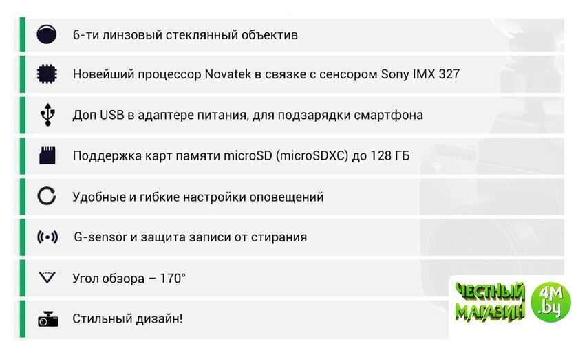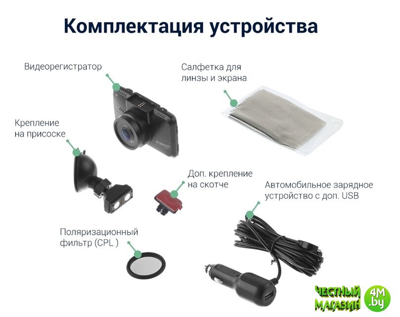 | Комплектация | - видеорегистратор;- поляризационный фильтр (CPL);- крепление на присоске;- доп. крепление на 3М скотче;- автомобильное зарядное устройство;- салфетка для линзы и экрана. |
