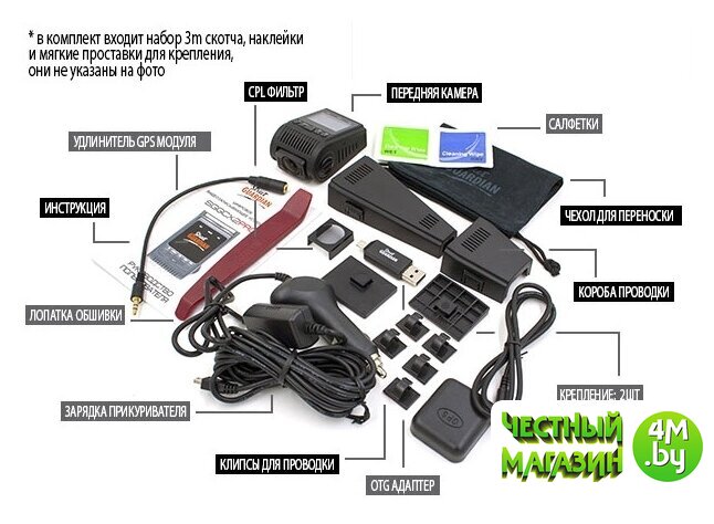 Комплектация | - Видеорегистратор- Кабель питания от прикуривателя в авто 12V-24V - Картридер с функцией OTG - Кронштейн для крепления - Пластиковая лопатка для прокладки кабеля - Дополнительный 3M для кронштейна крепления - Крышка короба для укладки кабелей - Основание короба для укладки кабелей - Клипсы для прокладки кабеля - Уплотнители для прокладки между видеорегистратором и кронштейном крепления - Мешочек из микрофибры для хранения видеорегистратора - Краткая инструкция по эксплуатации - Нить для снятия кронштейна крепления - Стикер Street Guardian - Салфетки для очистки стекла - Стикер с предупреждением о записи * - Комплектация может изменяться производителем без уведомления, уточняйте при покупке * - Карта памяти MicroSD (В КОМПЛЕКТ НЕ ВХОДИТ) |