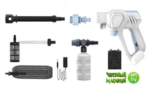 | Комплектация | - Мойка 1 шт. - Пенообразователь - 1 шт. - Шланг 6 м - Батарея - 1 шт. - Зарядное устройство - 1 шт |