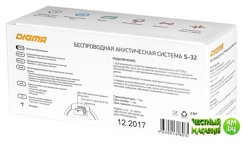 | Комплектация | • Колнка S-32• USB-кабель для питания• Аудиокабель• Руководство пользователя |